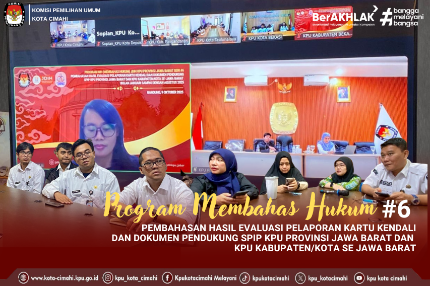 CIMAHI - KPU Kota Cimahi mengikuti Program MH (membahas Hukum) Jaringan Dokumentasi dan Informasi Hukum (JDIH) yang diselenggarakan oleh KPU Provinsi Jawa Barat secara daring, Kamis (9/10/2025). Program Membahas Hukum JDIH KPU Provinsi Jawa Barat seri #6 ini membahas Hasil Evaluasi Pelaporan Kartu Kendali dan Dokumen Pendukung SPIP KPU Provinsi Jawa Barat dan KPU Kabupaten/Kota se Jawa Barat Bulan Januari sampai dengan Agustus 2025, acara dubuka oleh Kepala Bagian Teknis Penyelenggaraan Pemilu dan Hukum KPU Provinsi Jawa Barat Sophia Kurniasari Purba, didampingi Kepala Sub Bagian Hukum KPU Provinsi Jawa Barat Hasanuddin Ismail, dengan narasumber dari Inspektur Wilayah III, Inspektorat Utama Sekretariat Jenderal KPU RI, Ferry Syahminan dan Auditor Ahli Madya Inspektorat Utama, Sekretariat Jenderal KPU RI, Gusni Yulianti. Ketua Divisi Hukum dan Pengawasan, Emsidelva Okasti, Sekretaris KPU Kota Cimahi, Charlyasi M. Siadari, Kepala Sub Bagian Teknis Penyelenggaraan Pemilu dan Hukum Wina Winiarti, Kasubag Perencanaan dan Data Informasi VIvid Firmawan, bersama staf dan CPNS KPU Kota Cimahi, hadir dalam kegiatan ini. JDIH KPU Provinsi Jawa Barat seri #6 bertajuk mengenal Sistem Pengendalian Intern Pemerintah (SPIP) ini, juga dihadiri oleh Tim Satgas SPIP KPU Kabupaten/Kota se-Jawa Barat, dalam kesempatan ini dilakukan asistensi oleh Tim Penanggungjawab SPIP Wilayah Jawa Barat bagi satuan kerja yang pelaporan SPIP belum rampung. Acara ditutup oleh Ketua Divisi Hukum dan Pengawasan KPU Provinsi Jawa Barat Aneu Nursifah, memberikan arahan dan mengingatkan agar seluruh satuan kerja KPU di 27 (dua puluh tujuh) Kabupaten/Kota se Jawa Barat untuk segera menuntaskan pelaporan SPIP masing-masing, sebagai bentuk komitmen terhadap transparansi dan akuntabilitas kinerja KPU. (dsp) ....