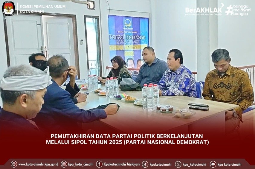 CIMAHI – KPU Kota Cimahi kembali melanjutkan rangkaian agenda pemutakhiran data partai politik tahun 2025. Pada Senin (15/12/2025), jajaran pimpinan KPU Kota Cimahi menggelar pertemuan koordinasi dan asistensi teknis bersama DPD Partai NASDEM Kota Cimahi. Kegiatan ini merupakan bagian dari upaya rutin KPU untuk memastikan data kepengurusan dan keanggotaan partai tetap mutakhir melalui platform Sistem Informasi Partai Politik (SIPOL). Dengan pembaruan secara real-time, KPU berharap seluruh data administratif partai politik di Kota Cimahi memiliki akuntabilitas yang tinggi. "Tujuan utama kunjungan ini adalah memastikan bahwa data Partai NASDEM di Kota Cimahi selaras dengan kondisi faktual terkini di lapangan dan telah terverifikasi secara sah dalam sistem nasional. Validitas data ini adalah kunci fondasi Pemilu yang kuat di masa depan," ungkap perwakilan pimpinan KPU Kota Cimahi. (Parmas KPU Kota CImahi) ....