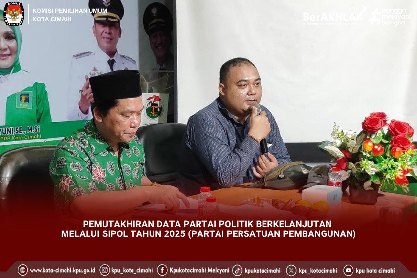 CIMAHI – KPU Kota Cimahi terus berkomitmen menjaga kualitas dan validitas data peserta Pemilu secara berkelanjutan. Pada Senin (15/12/2025), jajaran pimpinan KPU Kota Cimahi melaksanakan kunjungan koordinasi sekaligus asistensi pemutakhiran data partai politik tahun 2025 bersama DPC Partai Persatuan Pembangunan (PPP) Kota Cimahi. Fokus utama dari pertemuan ini adalah sinkronisasi data kepengurusan dan keanggotaan melalui platform Sistem Informasi Partai Politik (SIPOL). Melalui sistem ini, pembaruan data dilakukan secara real-time untuk memastikan administrasi partai di tingkat daerah selaras dengan kondisi faktual di lapangan serta terverifikasi secara akurat dalam sistem nasional. "Pembaruan data yang rutin dan akurat merupakan fondasi penting agar tahapan Pemilu mendatang berjalan lebih kuat dan akuntabel. Kami memastikan data PPP di Kota Cimahi telah sesuai dengan kondisi terkini," jelas perwakilan pimpinan KPU Kota Cimahi di sela-sela kegiatan. (Parmas KPU Kota Cimahi) ....