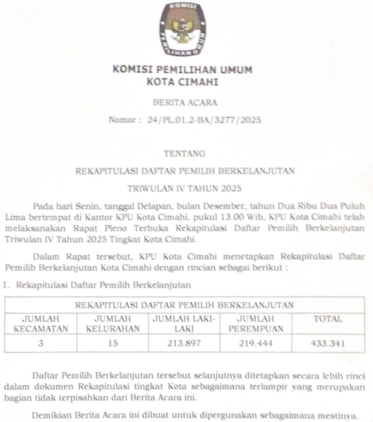 Dalam Rapat tersebut, KPU Kota Cimahi menetapkan Rekapitulasi Daftar Pemilih Berkelanjutan Kota Cimahi dengan rincian sebagai berikut :