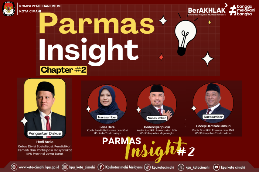 CIMAHI - KPU Provinsi Jawa Barat menyelenggarakan Parmas Insight chapter #2 dengan tema Pendidikan Pemilih Berkelanjutan di luar Masa Tahapan (Best Practice Menjaga Kesadaran Politik Masyarakat) secara daring, Rabu (15/10/2025).