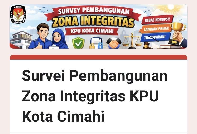 Survei Pembangunan Zona Integritas KPU Kota Cimahi Sabtu, 20 Desember 2025 12:22 31 Survei Pembangunan Zona Integritas KPU Kota Cimahi.. Klik disini Bagikan: Telah dilihat 31 kali