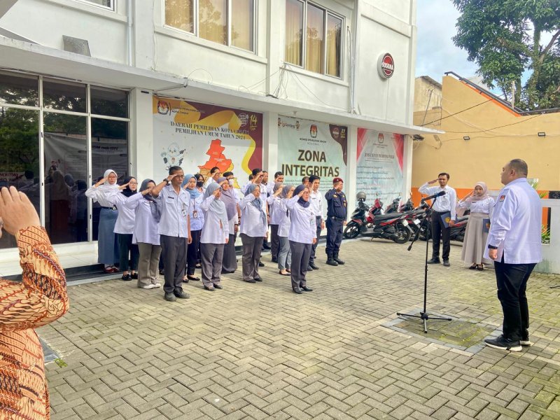 CIMAHI - Ketua KPU Kota Cimahi Anzhar Ishal Afryand menjadi Pembina Apel Pagi, Senin (2/2/2026).