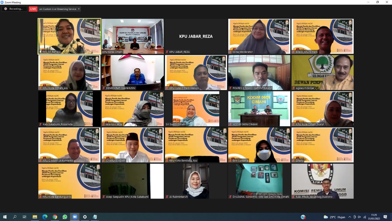 Cimahi, Webinar Ngaca (ngajak maca), yang digelar oleh KPU Kota Cimahi dengan tema”Menuju Pemilu dan Pemilihan 2024: Penguatan Literasi Peraturan Perundang-Undangan Kepemiluan, melalui aplikasi Zoom Meeting (daring), pada Senin, 31/1/2022. Dengan Narasumber dari KPU Provinsi Jawa Barat, yaitu Ketua Divisi Sosialisasi Pendidikan Pemilih dan Parmas Idham Holik, dan Ketua Divisi Hukum dan Pengawasan Reza Alwan Sovnidar.
