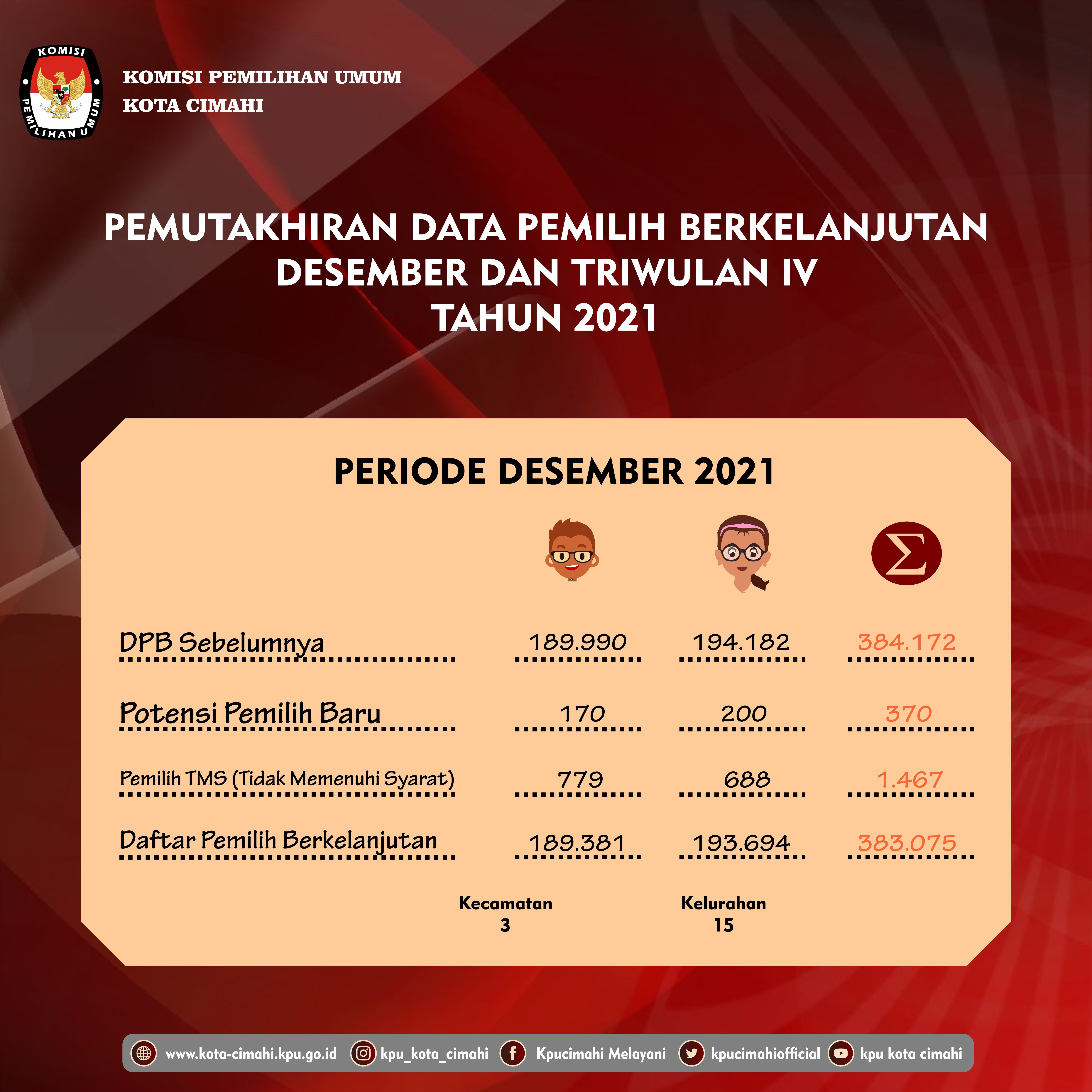 Jumlah pemilih yang telah dilakukan pencermatan dan direkap pada Rapat Rekapituasi Daftar Pemilih Berkelanjutan Tahun 2021 periode bulan Desember adalah Sebanyak 383.075pemilih, dengan rincian pemilih laki-laki berjumlah 189.381 pemilih dan pemilih perempuan berjumlah 193.694 pemilih yang tersebar di 3 Kecamatan se-Kota Cimahi. Sementara itu Rekapituasi Daftar Pemilih Berkelanjutan Triwulan IV dengan rincian Potensi Pemilih Baru Laki-Laki dan Perempuan 706, Potensi Pemilih TMS Laki-Laki dan Perempuan 3.313.