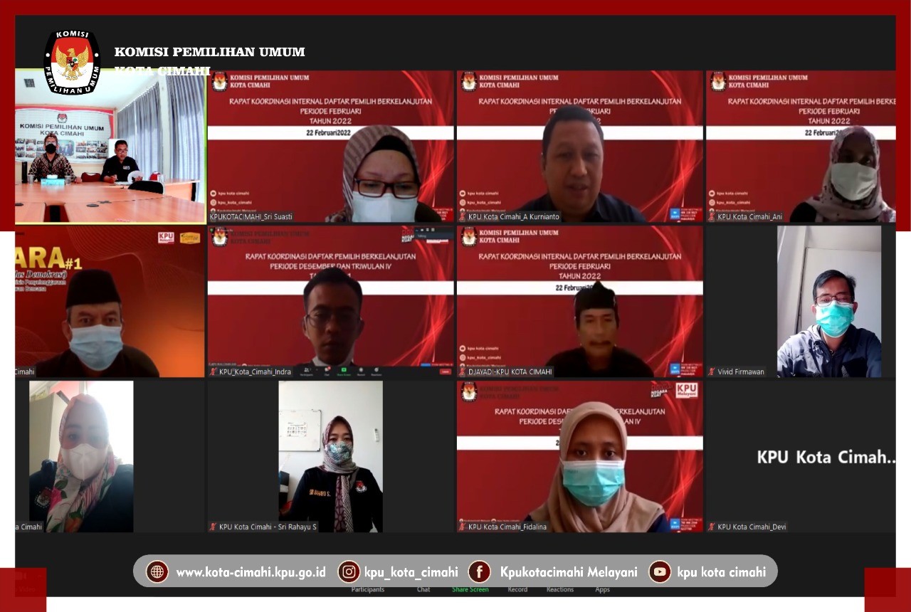 berdasarkan Peraturan Komisi Pemilihan Umum Republlik Indonesia Nomor 6 Tahun 2021 tentang Pemutakhiran Data Pemilih Berkelanjutan, pada hari Selasa, 22 Februari 2022, bertempat di Kantor KPU Kota Cimahi. KPU Kota Cimahi telah melaksanakan Rapat Internal Bulanan Daftar Pemilih Berkelanjutan Periode Bulan Januari Tahun 2022 Tingkat Kota Cimahi.