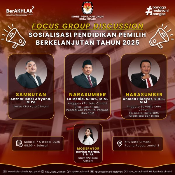 CIMAHI - Bertempat di Ruang Rapat KPU Kota Cimahi, KPU Kota Cimahi menyelenggarakan Focus Group Discussion Sosialisasi Pendidikan Pemilih Berkelanjutan Tahun 2025, Selasa (7/10/2025). FGD dibuka oleh Ketua KPU Kota Cimahi, Anzhar Ishal Afryand, dihadiri oleh seluruh Anggota KPU Kota Cimahi. Dengan menghadirkan narasumber Ketua Divisi Sosialisasi, Pendidikan Pemilih, Partisipasi Masyarakat dan Sumber Daya Manusia, La Media serta Ahmad Hidayat, Anggota Bawaslu Kota Cimahi. FGD juga diikuti oleh perwakilan siswa dari berbagai Sekolah Menengah Atas dan Sekolah Menengah Kejuruan serta Sekolah Madrasah Aliyah diseluruh Kota Cimahi. Ahmad memberikan paparan tentang Peran Pemilih Pemula dalam Demokrasi yang sebagian besar adalah pelajar SMA/SMK ini, memiliki peran besar dalam menentukan masa depan bangsa melalui hak pilihnya. Suara mereka penting untuk menciptakan pemerintahan yang jujur, adil, dan berpihak pada rakyat. Selanjutnya pentingnya menjadi pemilih cerdas, Ahmad juga menekankan agar para pelajar tidak mudah terpengaruh oleh informasi hoaks atau politik uang. Pemilih cerdas adalah yang mencari tahu visi, misi, dan rekam jejak calon sebelum memilih. Peserta juga dikenalkan pada Tugas dan Fungsi KPU dan Bawaslu dijelaskan bahwa Bawaslu bertugas mengawasi seluruh tahapan pemilu agar berjalan sesuai aturan, serta membuka ruang bagi masyarakat termasuk pemilih pemula untuk ikut mengawasi dan melaporkan jika terjadi pelanggaran. Nilai-Nilai Partisipasi dan Integritas juga diberikan pemahaman untuk menanamkan nilai kejujuran, tanggung jawab, dan partisipasi aktif sejak dini agar demokrasi di Indonesia tumbuh sehat dan berintegritas. Dan tentunya ajakan untuk terlibat aktif untuk tidak apatis terhadap pemilu, serta mulai menumbuhkan semangat ikut berkontribusi dalam kegiatan demokrasi baik sebagai pemilih, relawan, maupun agen perubahan di lingkungan sekolah dan masyarakat. Ketua Sosilalisasi Pendidikan Pemilih, Partisipasi Masyarakat dan Sumber Daya Manusia KPU Kota Cimahi, La Media kemudian memberikan kesempatan para siswa peserta FGD untuk berdiskusi secara kelompok dengan berbagai tema bahasan dan memberikan kesempatan para siswa untuk berdiskusi dan saling memberikan tanggapan. Diskusi berlangsung sangat hidup dan penuh antusiasme dari para peserta.dengan pertukaran ide antara narasumber dan peserta. Dengan dimoderatori oleh Staf Teknis Penyelenggaraan Pemilu dan Hukum KPU Kota Cimahi, Devina Martha Giovanni sehingga diskusi berlangsung sangat interaktif, dengan banyak peserta yang aktif bertanya dan berbagi pandangan.dan membuka wawasan baru bagi para pemilih pemula yang hadir pada kesempatan ini, Tujuan kegiatan ini adalah untuk memberikan gambaran tentang pentingnya proses demokrasi di Indonesia, tahapan pemilu, kendala dan hubungannya dengan Kegiatan ini bertujuan untuk memberikan pemahaman sejak dini mengenai pentingnya partisipasi dalam Pemilu dan Pemilihan serta menumbuhkan kesadaran akan peran generasi muda sebagai pemilih cerdas dan berintegras. Melalui kegiatan ini diharapkan para peserta dapat menjadi agen perubahan dalam lingkungan sekolah maupun masyarakat untuk menyebarkan semangat demokrasi. (dsp).