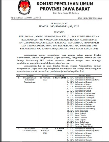 Perubahan Jadwal Tenaga Administrasi, Satuan Pengamanan (Jagat Saksana), Pengemudi dan Pramubakti Sekretariat KPU Prov Jabar Tahun 2023 dan Tenaga Pendukung Sekretariat PPK kab/kota Minggu, 26 Februari 2023 07:00 141 Perubahan Jadwal Tenaga Administrasi, Satuan Pengamanan (Jagat Saksana), Pengemudi dan Pramubakti Sekretariat KPU Prov Jabar Tahun 2023 dan Tenaga Pendukung Sekretariat PPK kab/kota. Untuk Selengkapnya unduh Disini Baca Selengkapnya