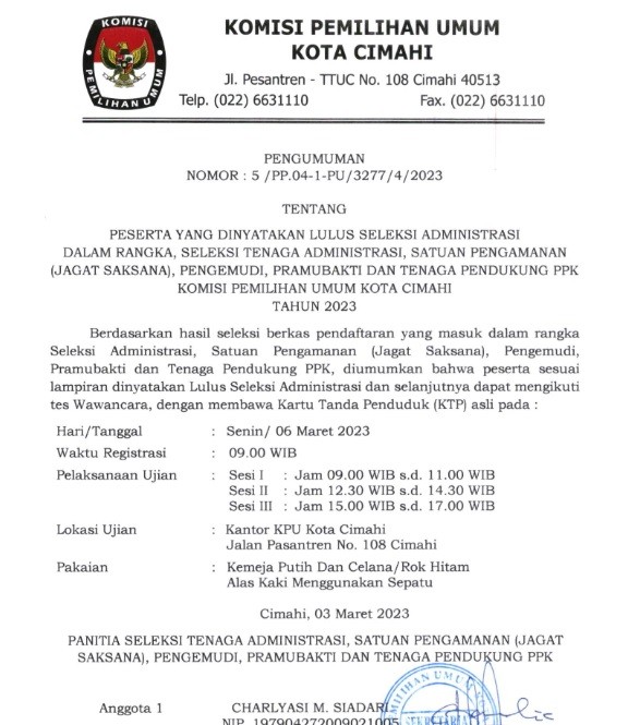 Pengumuman Tes Wawancara Pramubakti Tahun 2023 dan Tenaga Pendukung Sekretariat PPK kab/kota Jumat, 03 Maret 2023 08:00 257 Pengumuman Pramubakti Sekretariat KPU Prov Jabar Tahun 2023 dan Tenaga Pendukung Sekretariat PPK kab/kota. Unduh Selengkapnya Disini Baca Selengkapnya