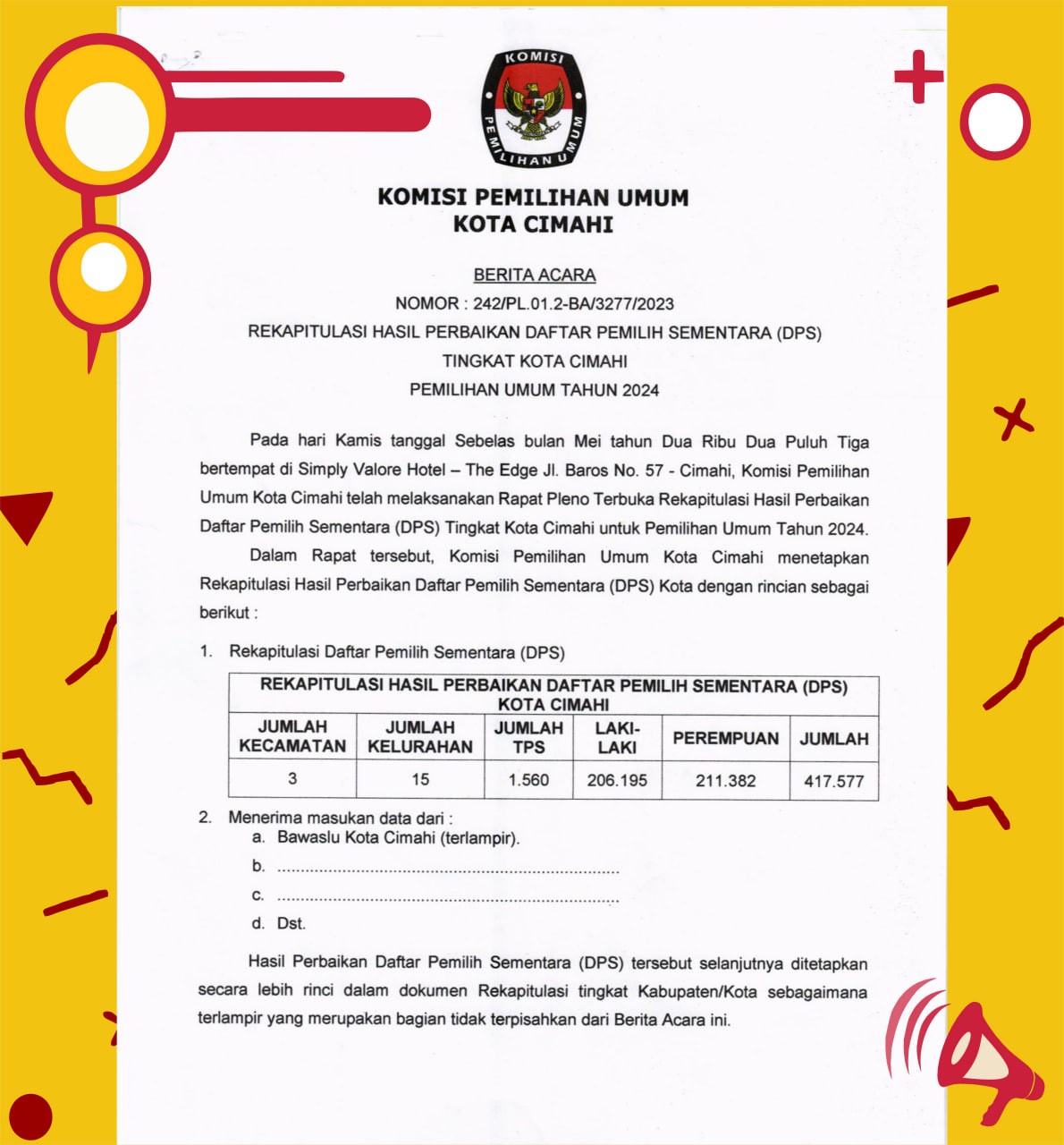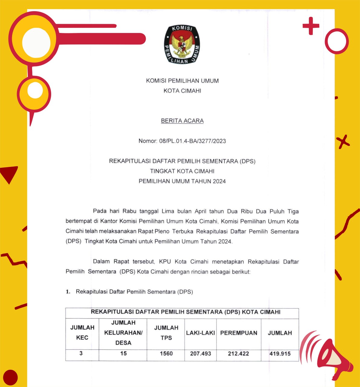 Rekapitulasi Daftar Pemilih Sementara (DPS) Kota Cimahi Tahun 2024 Kamis, 06 April 2023 09:00 366 Rekapitulasi Daftar Pemilih Sementara (DPS) Kota Cimahi Tahun 2024. Selengkapnya Unduh Disini Baca Selengkapnya