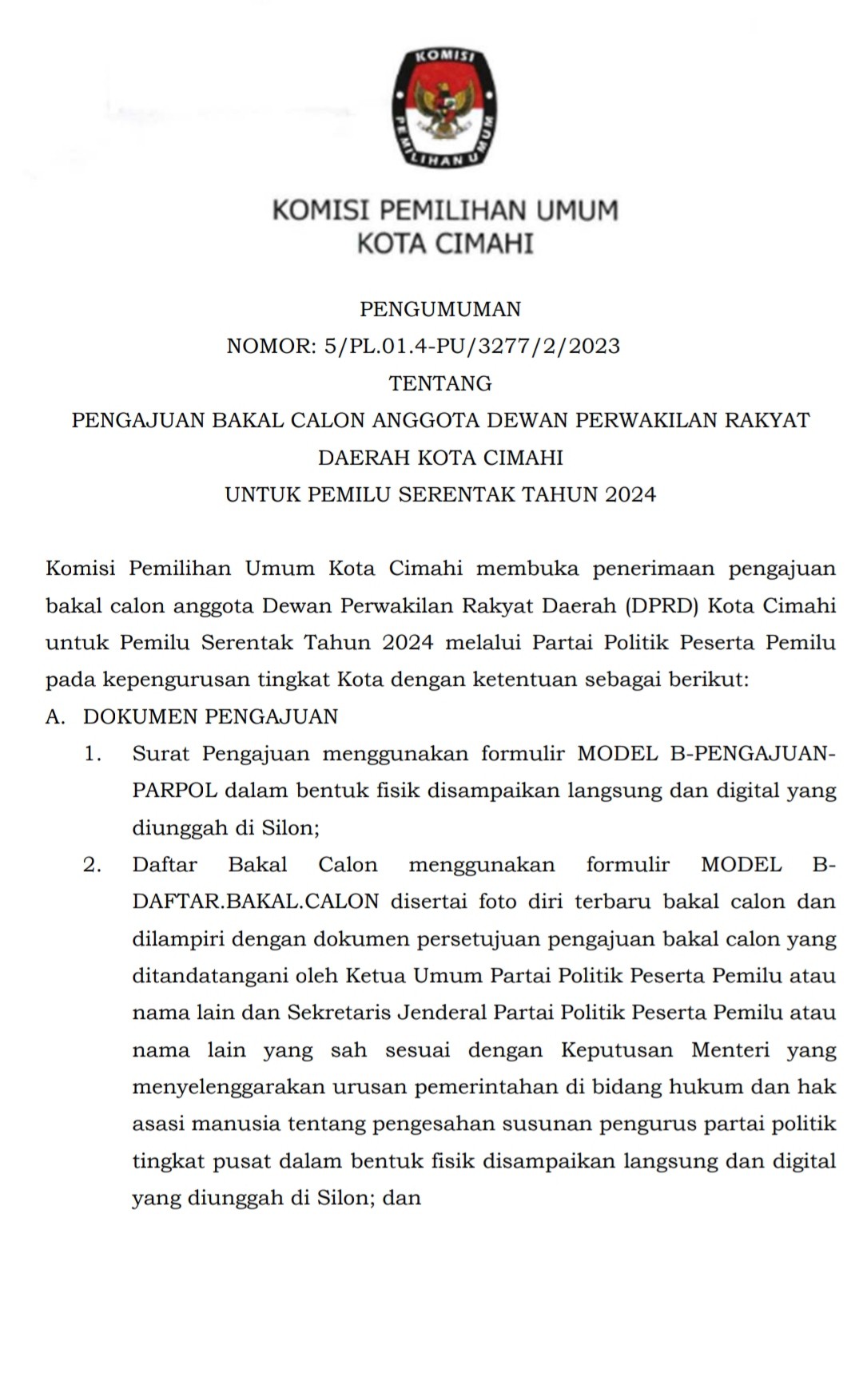 Pengajuan Bakal Calon Anggota Dewan Perwakilan Rakyat Daerah Kota Cimahi Untuk Pemilu Serentak Tahun 2024 Senin, 24 April 2023 08:00 284 Pengajuan Bakal Calon Anggota Dewan Perwakilan Rakyat Daerah Kota Cimahi Untuk Pemilu Serentak Tahun 2024. Untuk selengkapnya klik disini Baca Selengkapnya