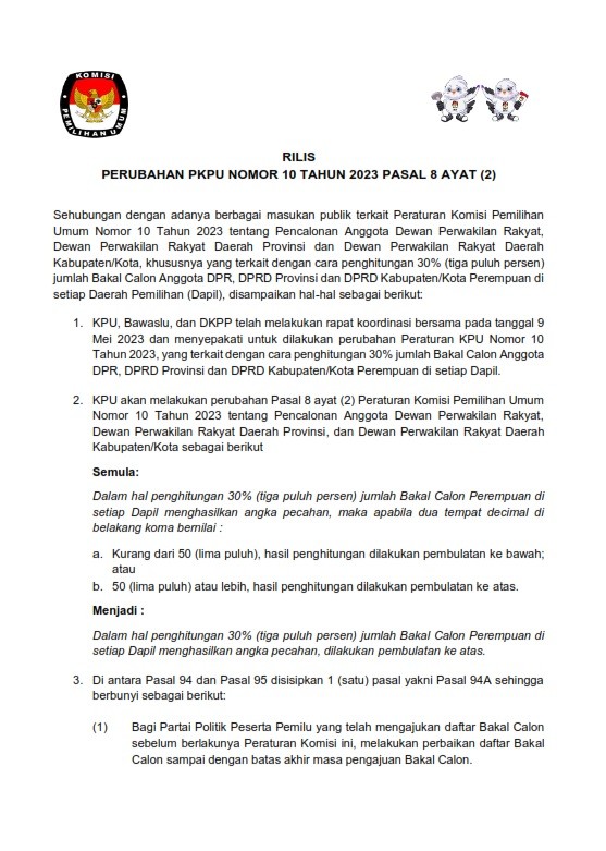 PERUBAHAN PKPU NOMOR 10 TAHUN 2023 PASAL 8 AYAR (2) Sabtu, 13 Mei 2023 08:00 77 PERUBAHAN PKPU NOMOR 10 TAHUN 2023 PASAL 8 AYAR (2). Unduh Selengkapnya Disini Baca Selengkapnya