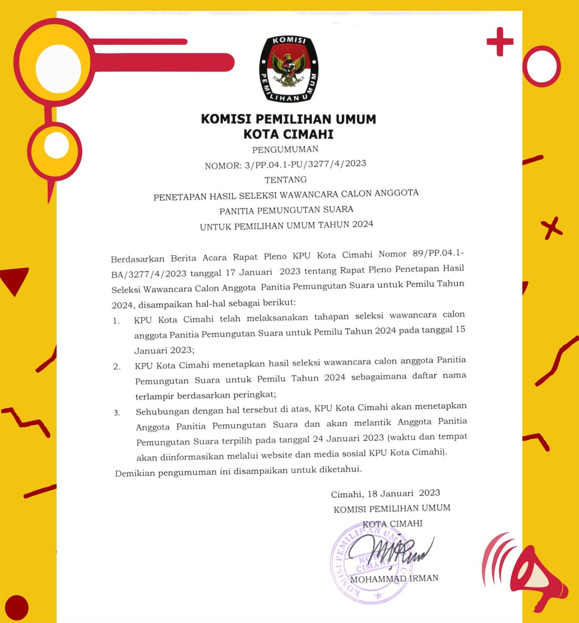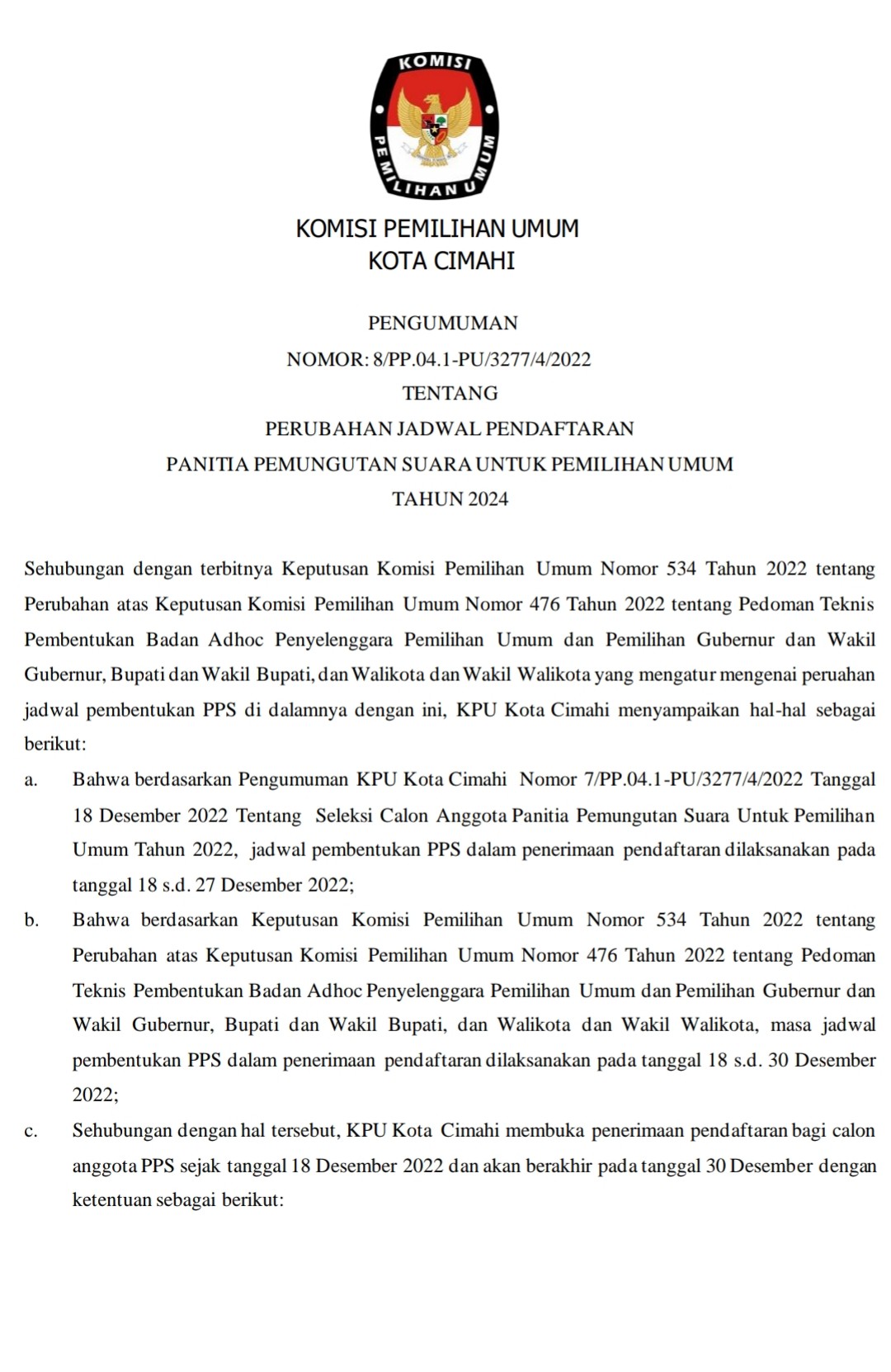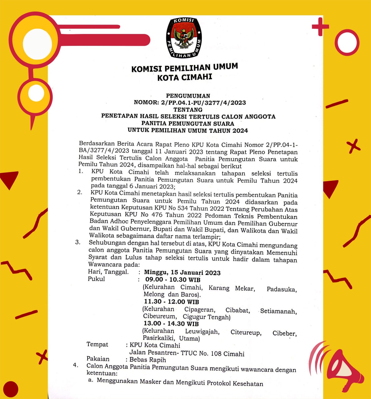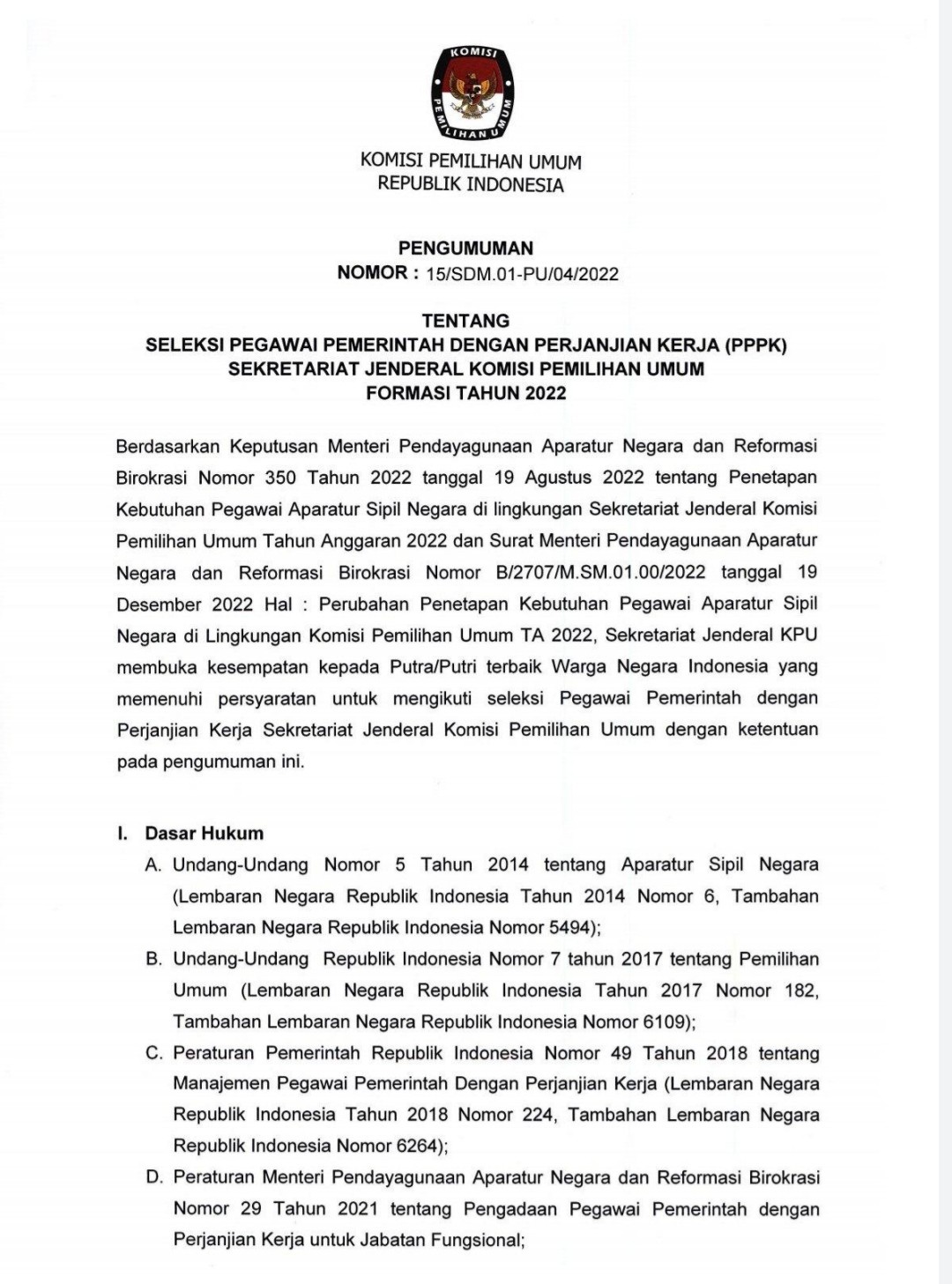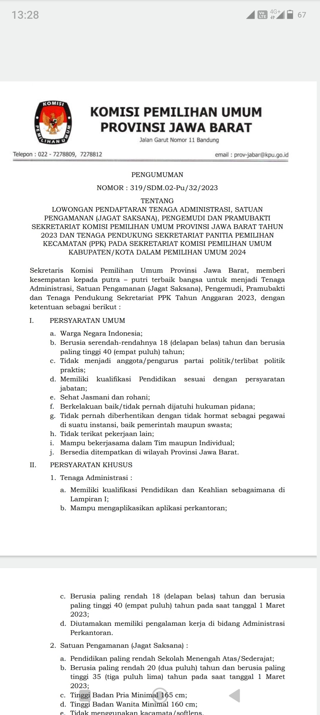 Lowongan Pendaftaran Tenaga Administrasi, Satuan Pengamanan (Jagat Saksana), Pengemudi dan Pramubakti Sekretariat KPU Provinsi Jawa barat Tahun 2023 dan Tenaga Pendukung Sekretariat Panitia Pemilihan Kecamatan (PPK) kab/kota Pemilihan Umum Tahun 2024. Unduh Selengkapnya Disini