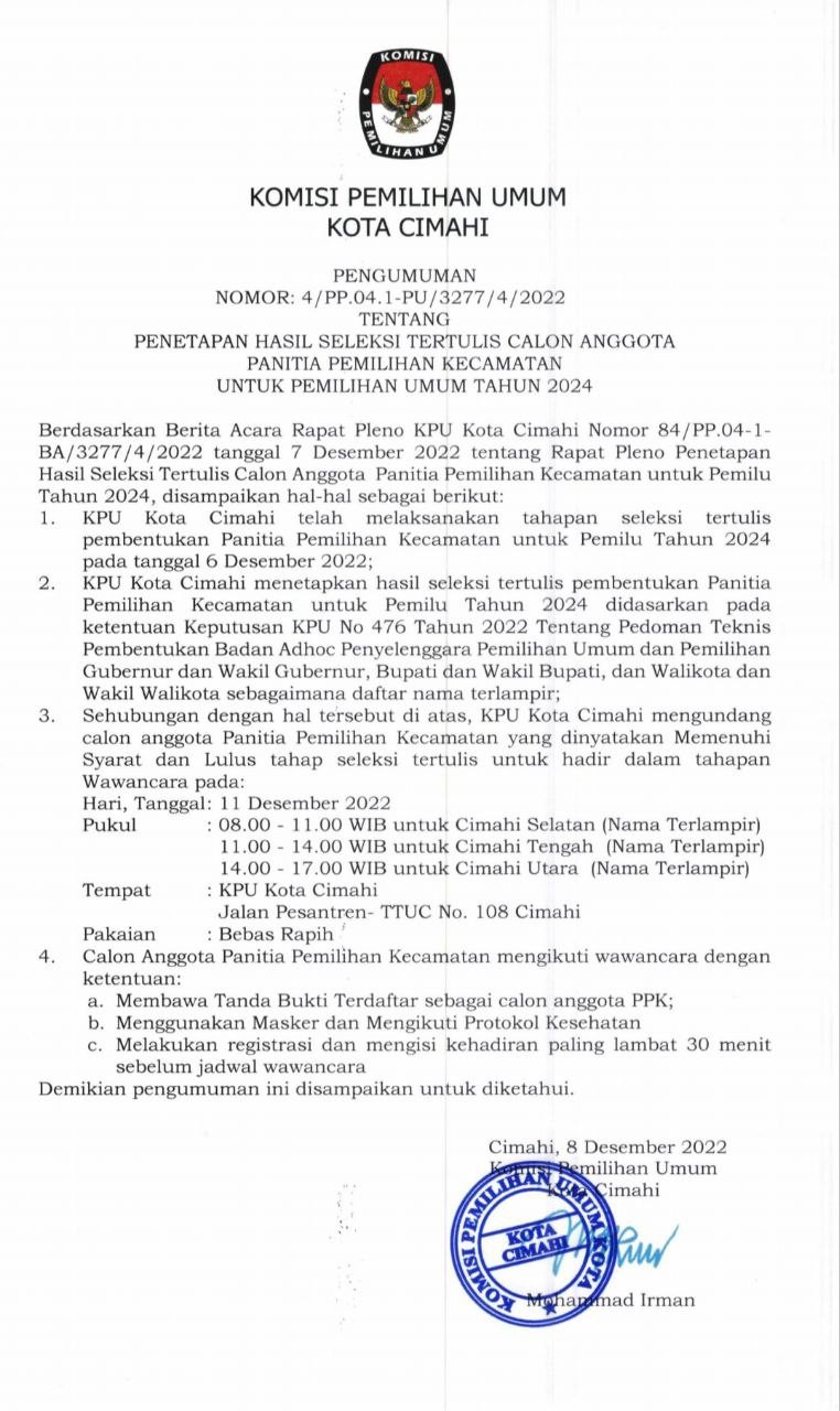 Penetapan Hasil Seleksi Tertulis Calon Anggota Panitia Pemilihan Kecamatan Untuk Pemilihan Umum tahun 2024 Kamis, 08 Desember 2022 08:00 222 Unduh Selengkapnya Disini Baca Selengkapnya