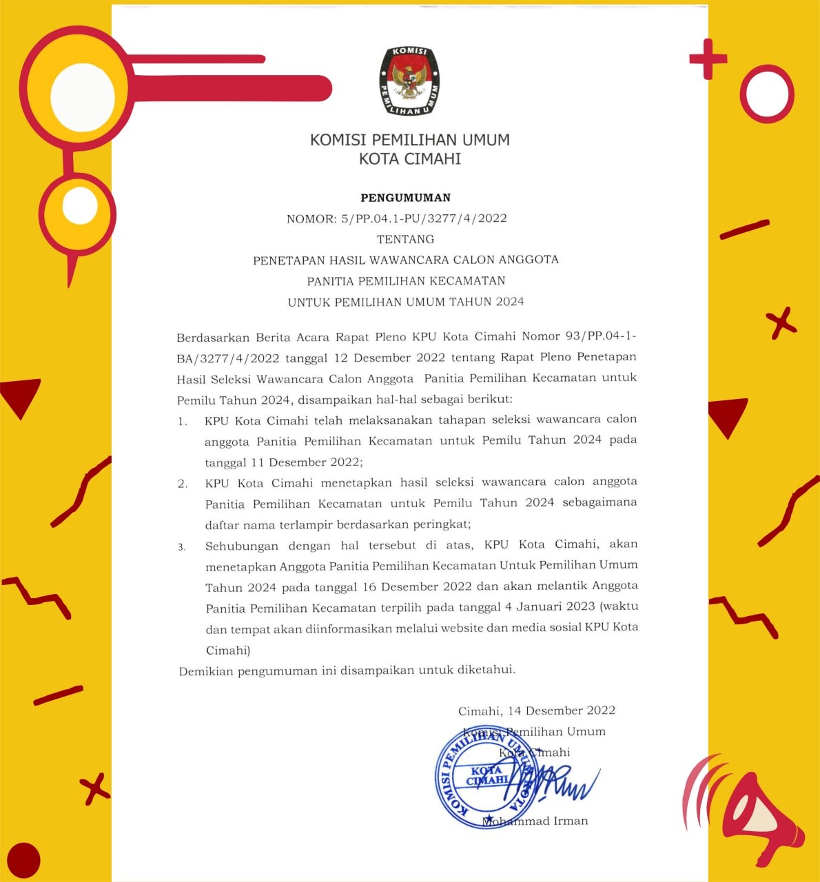 Penetapan Hasil Wawancara Calon Anggota Panitia Pemilihan Kecamatan (PPK) Pemilihan Umum Tahun 2024 Rabu, 14 Desember 2022 08:00 115 Untuk Selengkapnya Dapat Unduh Disini Baca Selengkapnya
