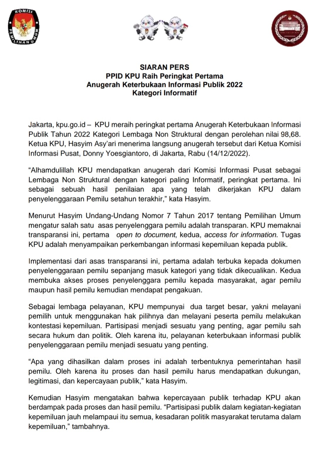 Siaran Pers PPID KPU Raih Peringkat Utama Anugerah Keterbukaan Informasi Publik 2022 Kategori Informatif Rabu, 14 Desember 2022 10:00 66 Unduh Selengkapnya Disini Baca Selengkapnya