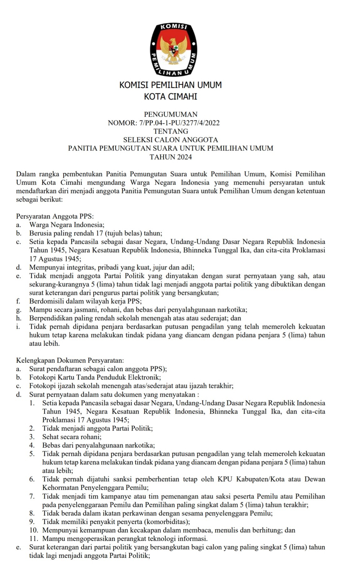Pengumuman Seleksi Calon Anggota Panitia Pemungutan Suara Pemilihan Umum Tahun 2024 Minggu, 18 Desember 2022 08:00 296 Unduh selengkapnya Disini Baca Selengkapnya