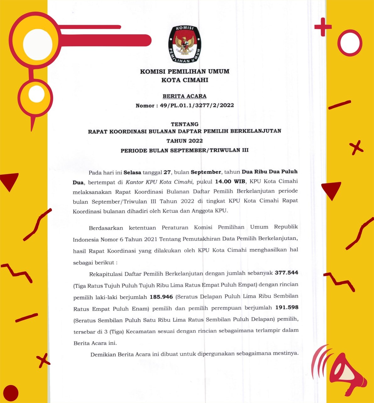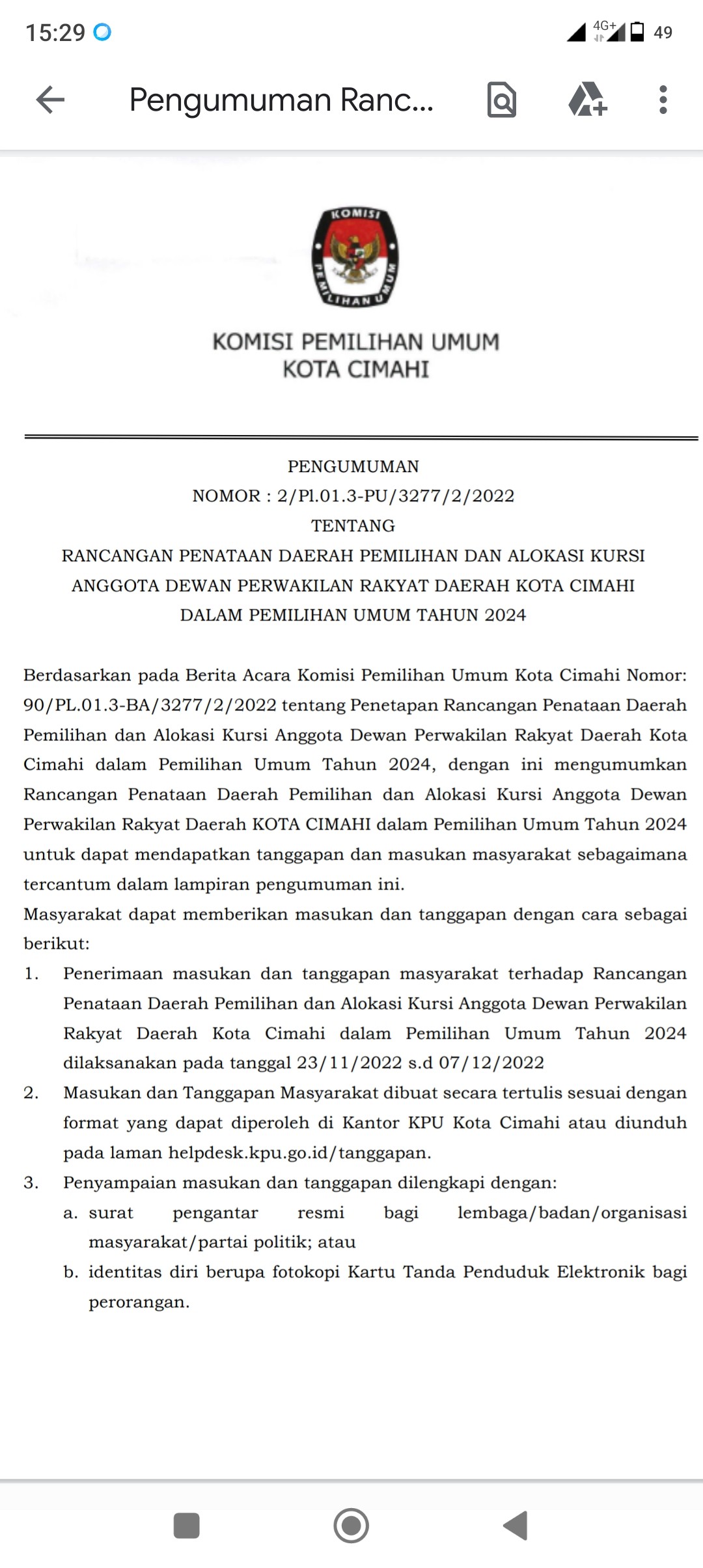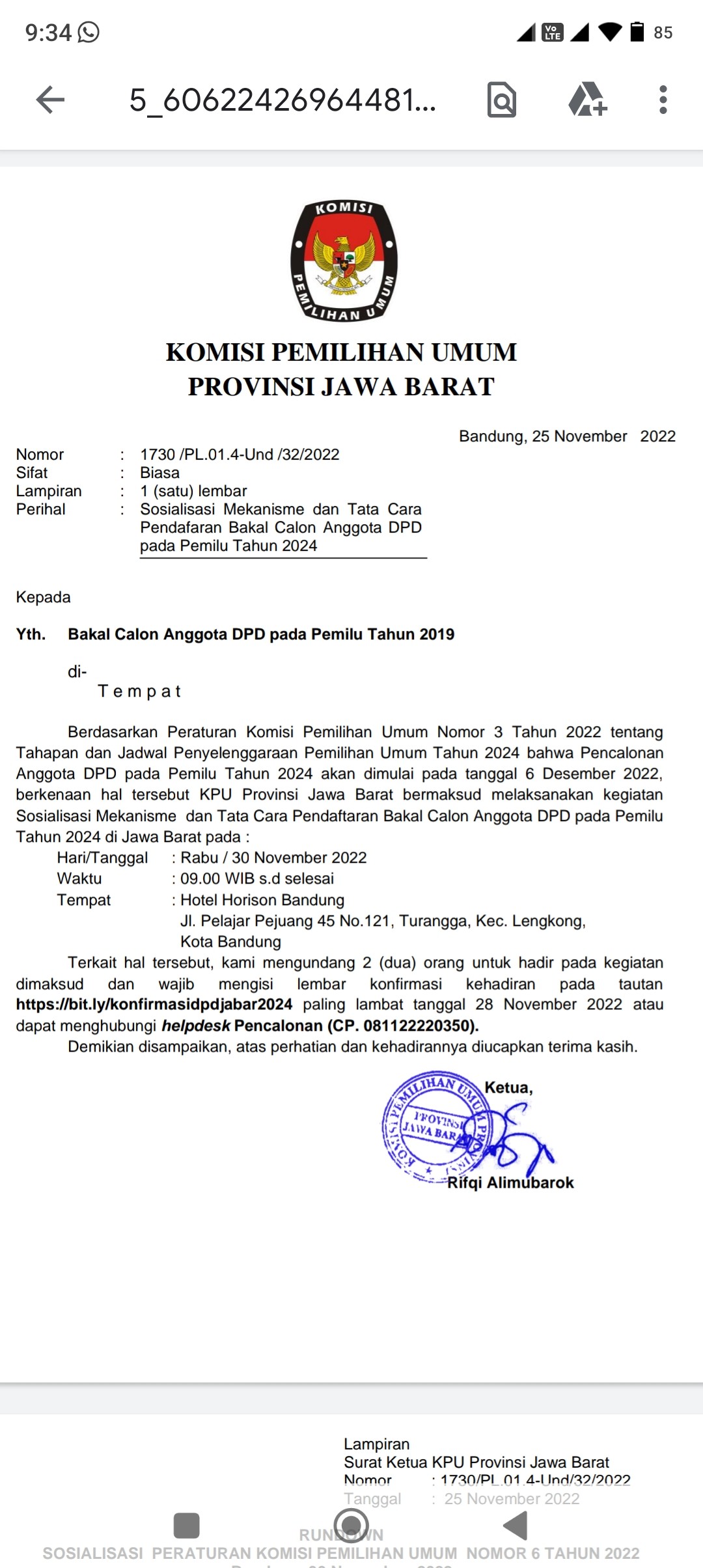 Dengan ini, KPU Provinsi Jawa Barat mengundang bakal calon DPD ntuk hadir dalam sosialisasi pendaftaran Bacalon DPD Provinsi Jawa Barat. Konfirmasi kehadiran dapat diisi di link https://bit.ly/konfirmasidpdjabar2024