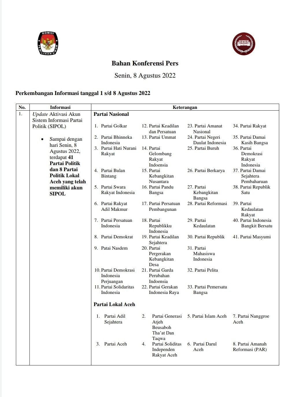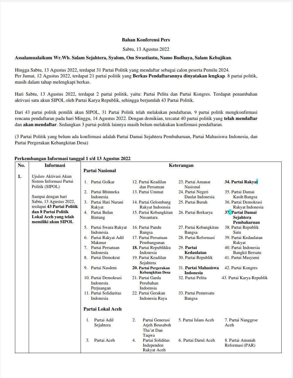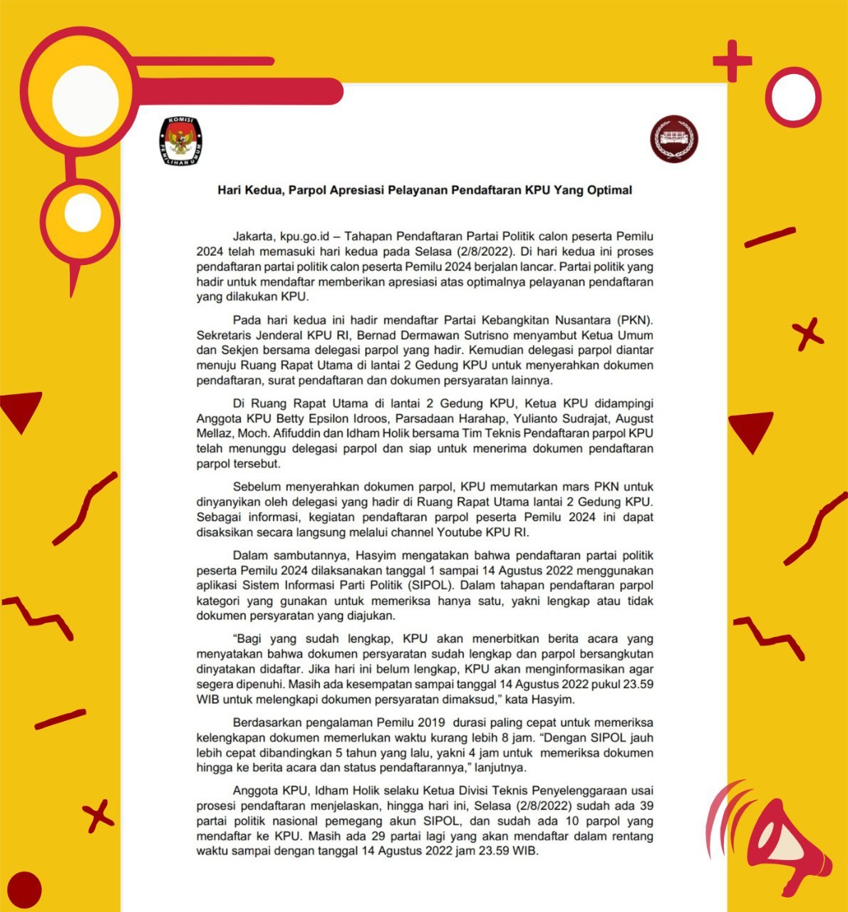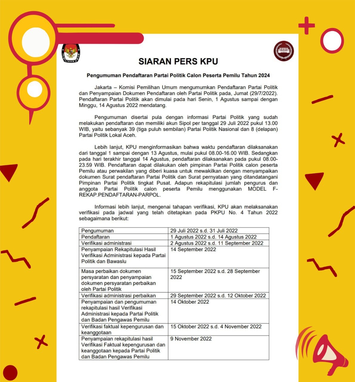 Siaran Pers KPU Tentang Pengumuman Pendaftaran Partai Politik Calon Peserta Pemilu Tahun 2024 Sabtu, 30 Juli 2022 08:00 377 Unduh selengkapnya Unduh Disini Baca Selengkapnya