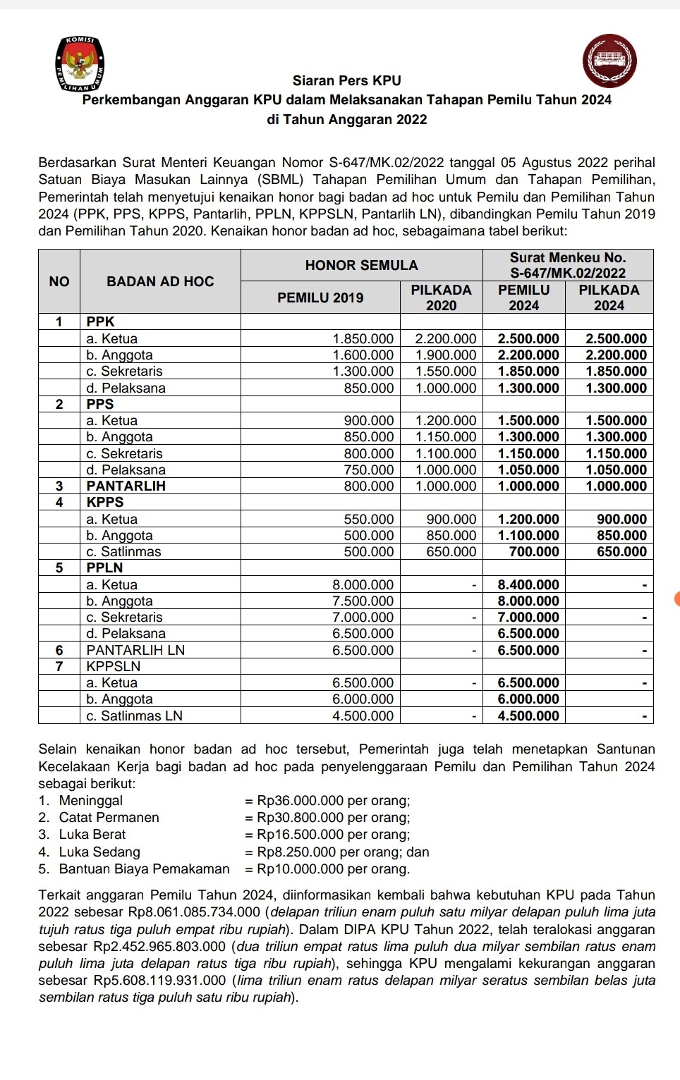 Siaran Pers KPU Perkembangan Anggaran KPU dalam Melaksanakan Tahapan Pemilu Tahun 2024 di Tahun Anggaran 2022 Senin, 08 Agustus 2022 17:00 390 Unduh Selengkapnya Disini Baca Selengkapnya