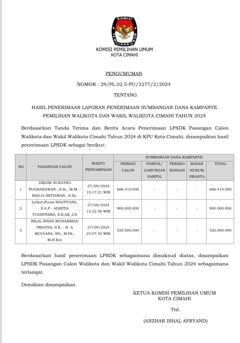 HASIL PENERIMAAN LAPORAN PENERIMAAN SUMBANGAN DANA KAMPANYE PEMILIHAN WALIKOTA DAN WAKIL WALIKOTA CIMAHI TAHUN 2024 Sabtu, 26 Oktober 2024 07:00 90 HASIL PENERIMAAN LAPORAN PENERIMAAN SUMBANGAN DANA KAMPANYE PEMILIHAN WALIKOTA DAN WAKIL WALIKOTA CIMAHI TAHUN 2024. Unduh selengkapnya disini Baca Selengkapnya