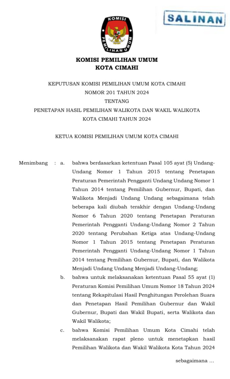 PENETAPAN HASIL PEMILIHAN WALIKOTA DAN WAKIL WALIKOTA KOTA CIMAHI TAHUN 2024 Rabu, 04 Desember 2024 00:01 205 PENETAPAN HASIL PEMILIHAN WALIKOTA DAN WAKIL WALIKOTA KOTA CIMAHI TAHUN 2024. Unduh selengkapnya disini Baca Selengkapnya