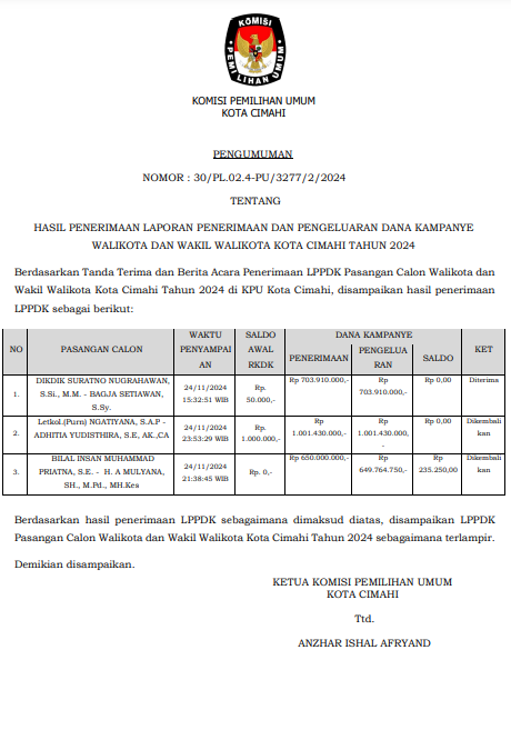 HASIL PENERIMAAN LAPORAN PENERIMAAN DAN PENGELUARAN DANA KAMPANYE PERBAIKAN PEMILIHAN WALIKOTA DAN WAKIL WALIKOTA KOTA CIMAHI TAHUN 2024 Kamis, 12 Desember 2024 10:11 423 HASIL PENERIMAAN LAPORAN PENERIMAAN DAN PENGELUARAN DANA KAMPANYE PERBAIKAN PEMILIHAN WALIKOTA DAN WAKIL WALIKOTA KOTA CIMAHI TAHUN 2024. Unduh selengkapnya dsini Baca Selengkapnya