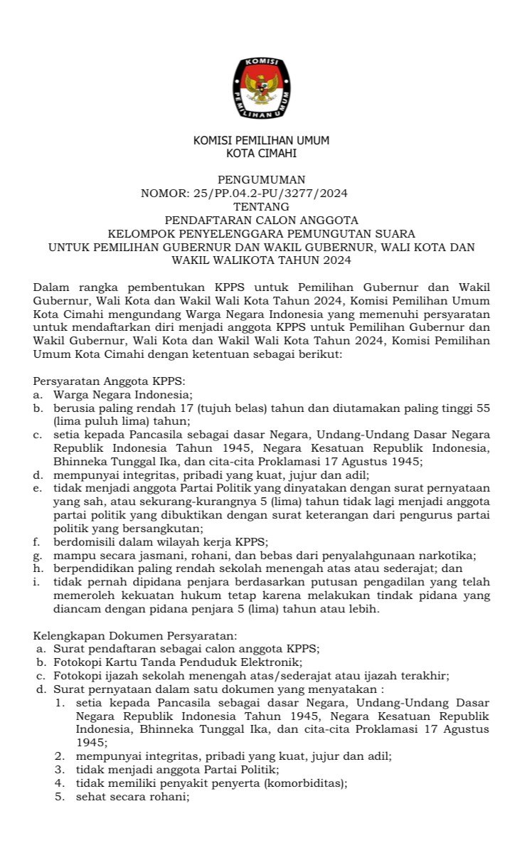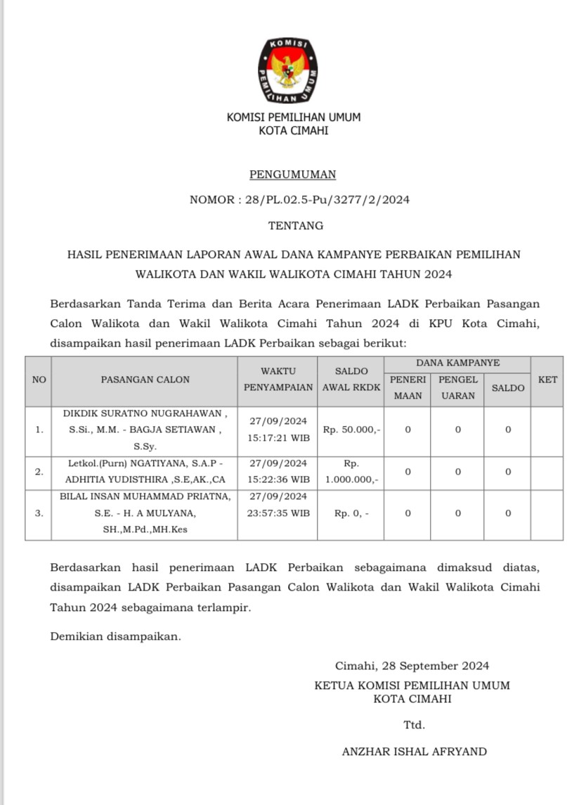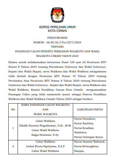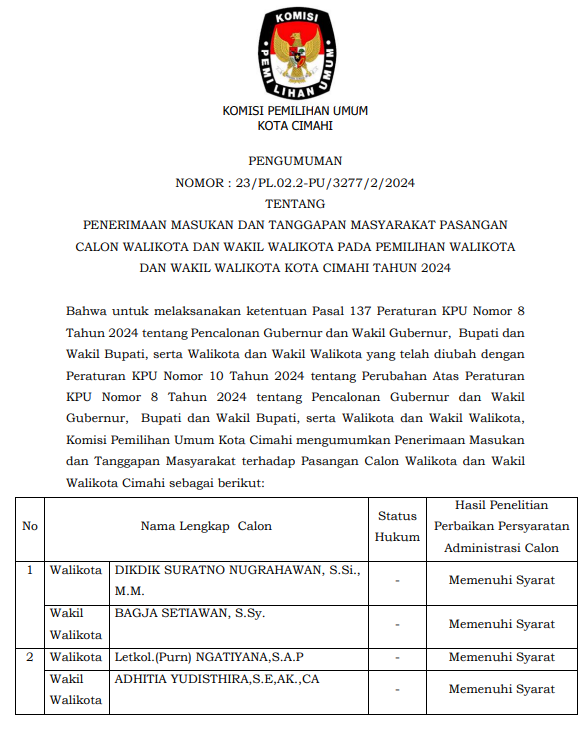 PENERIMAAN MASUKAN DAN TANGGAPAN MASYARAKAT PASANGAN CALON WALIKOTA DAN WAKIL WALIKOTA PADA PEMILIHAN WALIKOTA DAN WAKIL WALIKOTA KOTA CIMAHI TAHUN 2024. Unduh selengkapnya disini