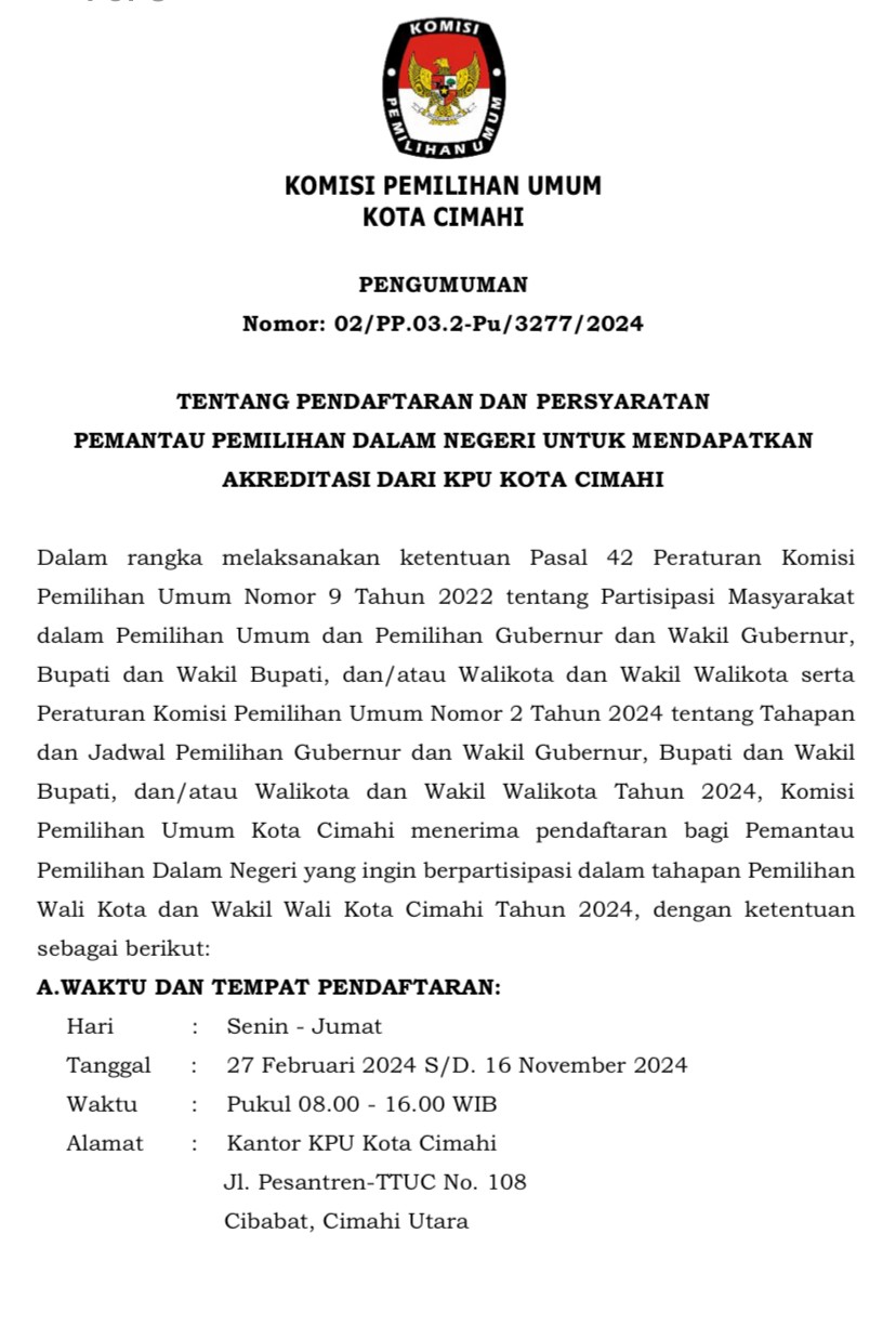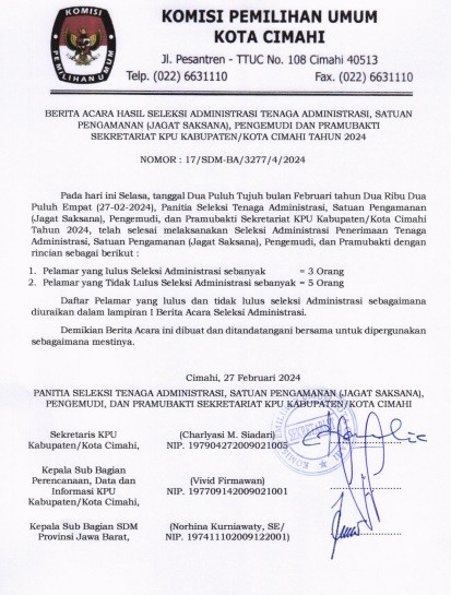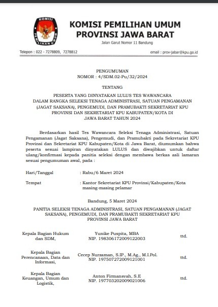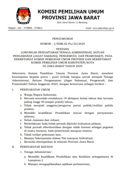 TENTANG LOWONGAN PENDAFTARAN TENAGA ADMINISTRASI, SATUAN PENGAMANAN (JAGAT SAKSANA), PENGEMUDI, DAN PRAMUBAKTI, PADA SEKRETARIAT KOMISI PEMILIHAN UMUM PROVINSI DAN SEKRETARIAT KOMISI PEMILIHAN UMUM KABUPATEN/KOTA DI JAWA BARAT TAHUN 2024. Unduh selengkapnya disini