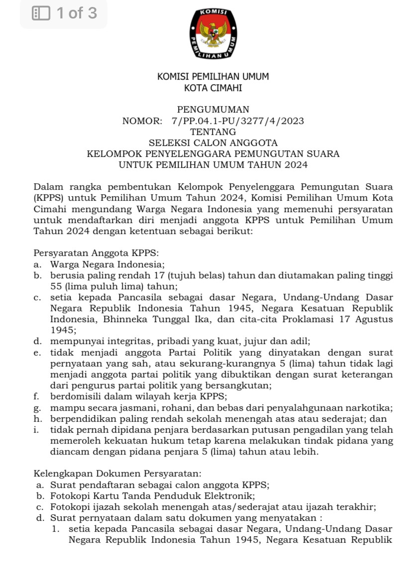 Seleksi Calon Anggota Kelompok Penyelenggara Pemungutan Suara Pemilihan Umum Tahun 2024 Minggu, 10 Desember 2023 13:00 401 Seleksi Calon Anggota Kelompok Penyelenggara Pemungutan Suara Pemilihan Umum Tahun 2024. Untuk selengkapnya klik disini Baca Selengkapnya