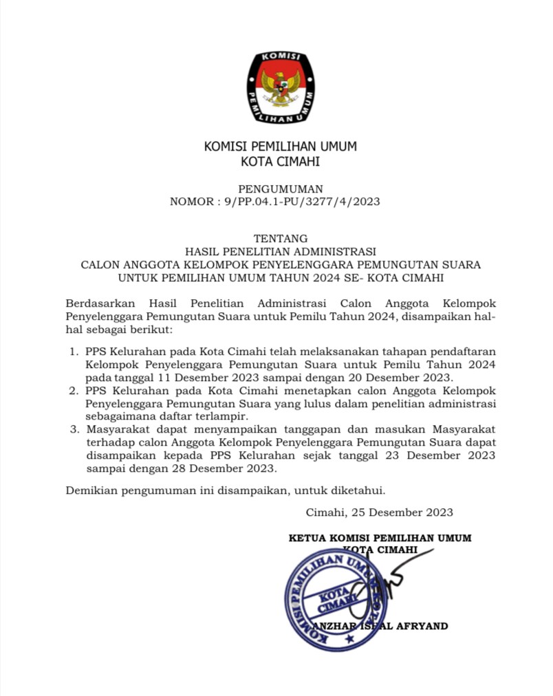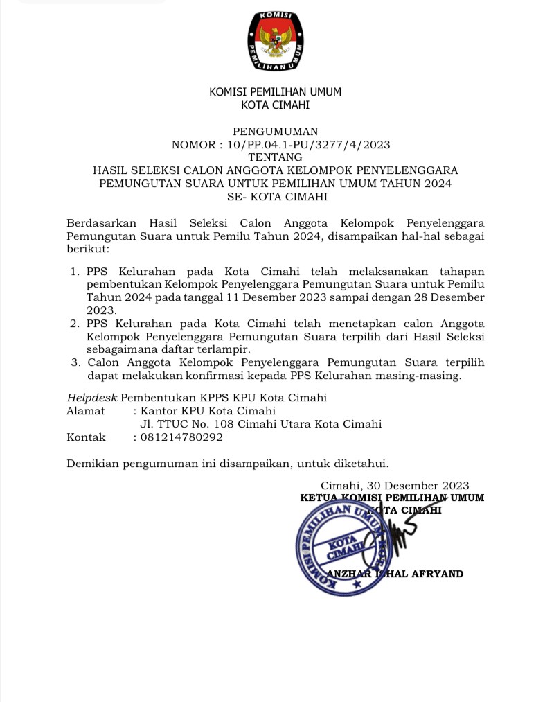 Hasil Seleksi Calon Anggota Kelompok Penyelenggara Pemungutan Suara Pemilu Tahun 2024 Sabtu, 30 Desember 2023 07:00 266 Hasil Seleksi Calon Anggota Kelompok Penyelenggara Pemungutan Suara Pemilu Tahun 2024. Unduh selengkapnya Disini Baca Selengkapnya
