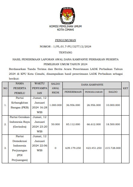 HASIL PENERIMAAN LAPORAN AWAL DANA KAMPANYE PERBAIKAN PESERTA PEMILIHAN UMUM TAHUN 2024 Sabtu, 13 Januari 2024 16:00 128 HASIL PENERIMAAN LAPORAN AWAL DANA KAMPANYE PERBAIKAN PESERTA PEMILIHAN UMUM TAHUN 2024. Untuk selengkapnya klik disini Baca Selengkapnya