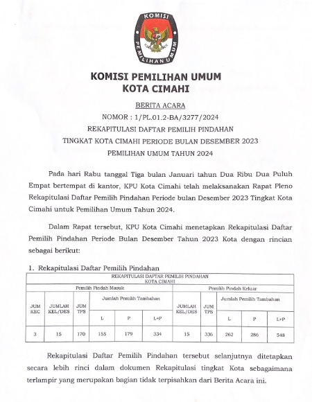 REKAPITULASI DAFTAR PEMILIH PINDAHAN TINGKAT KOTA CIMAHI PERIODE BULAN NOVEMBER 2023 PEMILIHAN UMUM TAHUN 2024 Rabu, 06 Desember 2023 07:00 53 REKAPITULASI DAFTAR PEMILIH PINDAHAN TINGKAT KOTA CIMAHI PERIODE BULAN NOVEMBER 2023 PEMILIHAN UMUM TAHUN 2024, Untuk selengkapnya silahkan klik disni Baca Selengkapnya